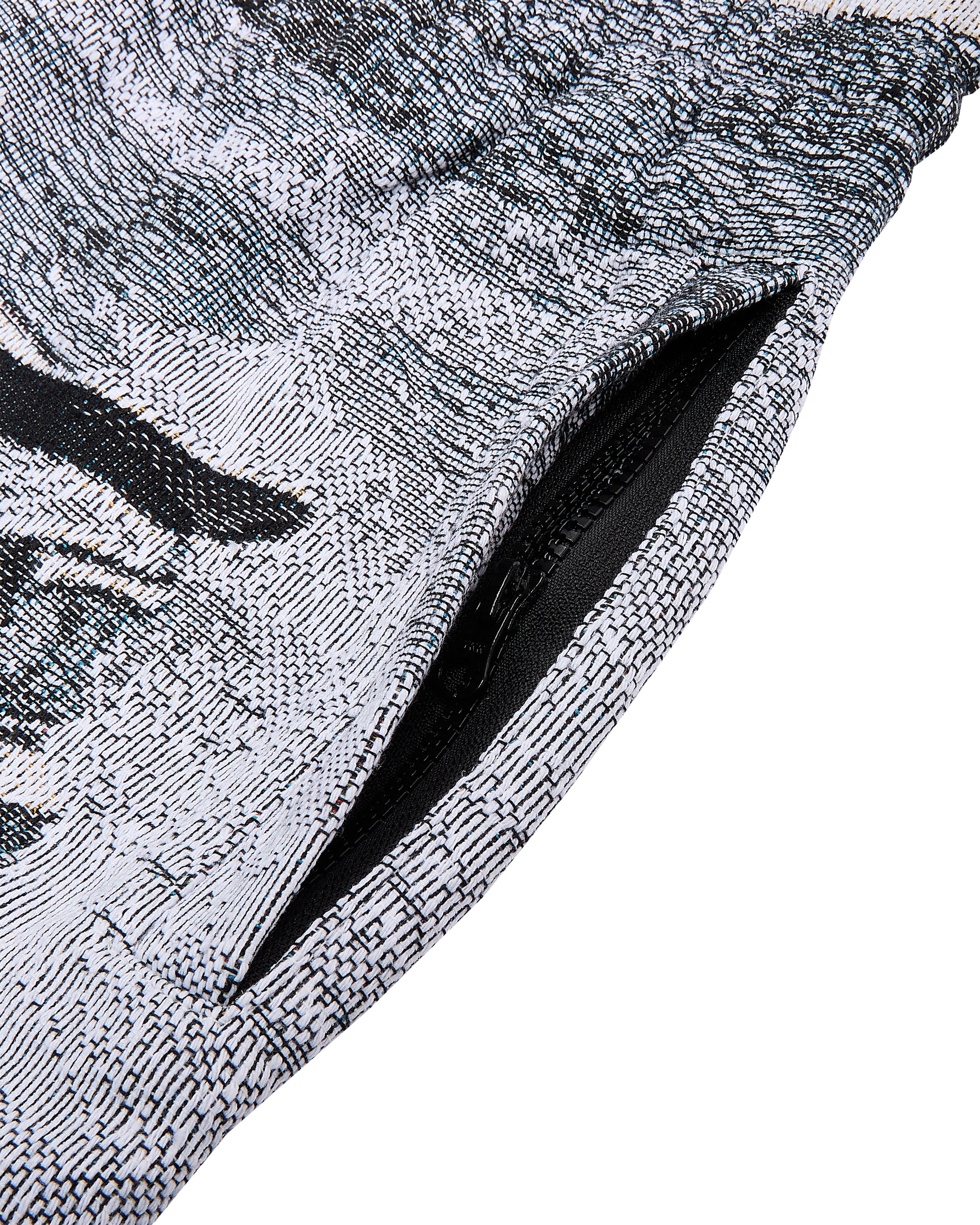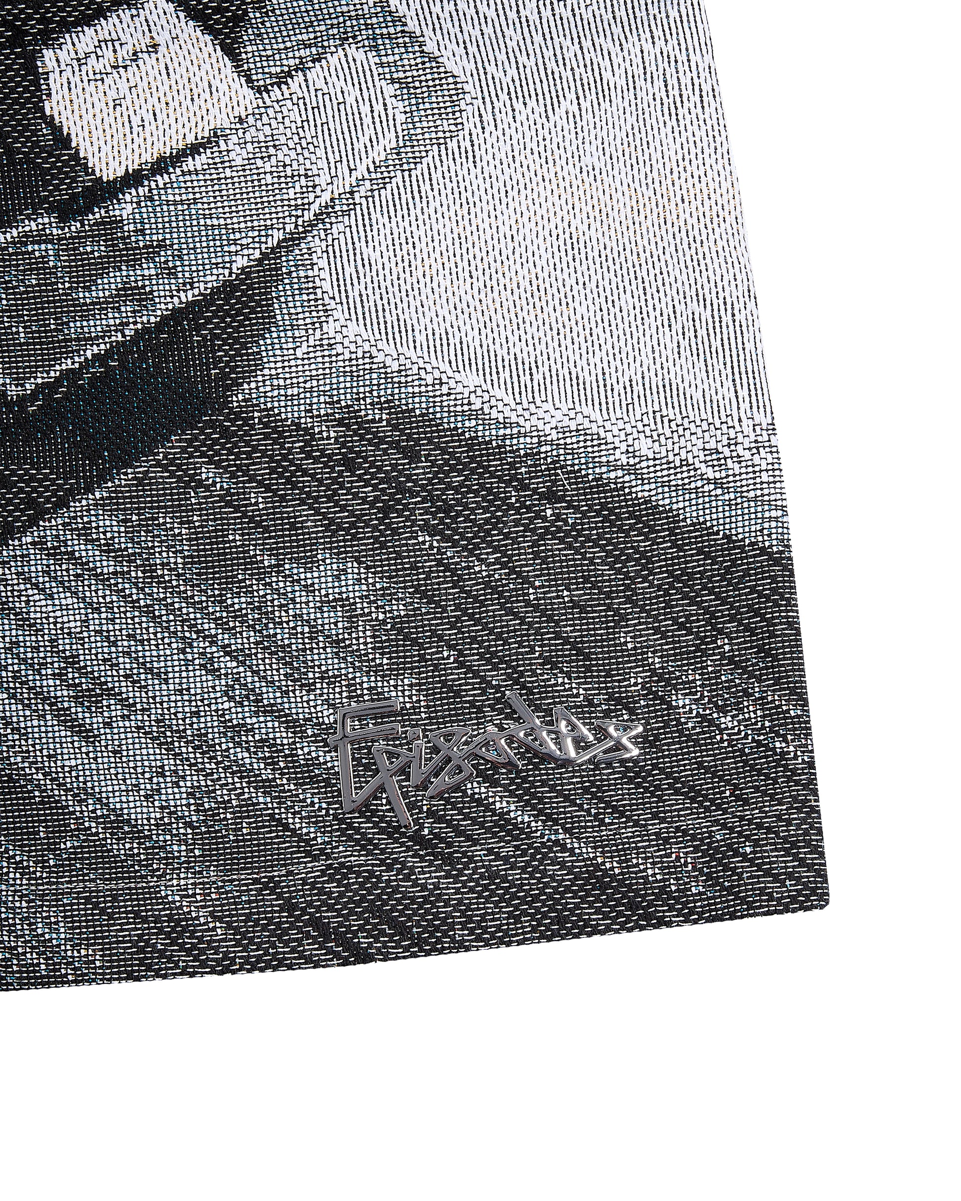 WASHING INSTRUCTIONS - Hand wash cold is highly recommended to preserve the integrity of the woven tapestry - If machine washing, turn garment inside out and wash alone on a gentle cycle - Machine wash cold (maximum 30°C / 86°F) - Use mild detergent - Wash with similar colours - Do not bleach - Avoid fabric softeners, as they may weaken woven fibres over time - Do not tumble dry - hang or lay flat to dry in shade to prevent shrinkage and distortion - Do not wring or twist the garment - Do not iron directly on the metallic logo - use a cool iron or steamer on the fabric surface if needed - May be dry cleaned if necessary, but not recommended due to potential impact on the woven structure and metal detailing - Can be hung, but preferably store folded to prevent stretching - Handle with care - the fabric is prone to snagging on jewellery, bags, or rough surfaces - If any snags or pulls occur, do not cut loose threads - gently pull them back through using tweezers or a blunt needle.